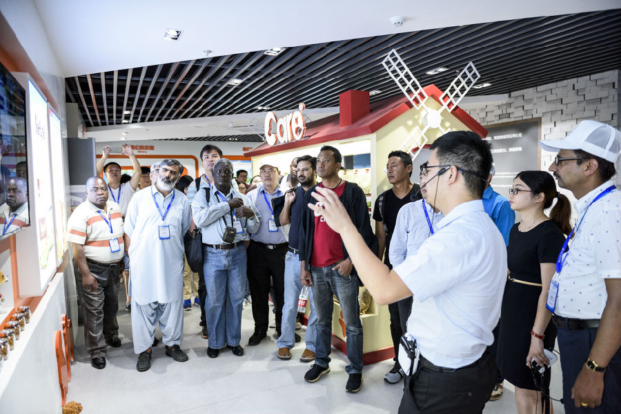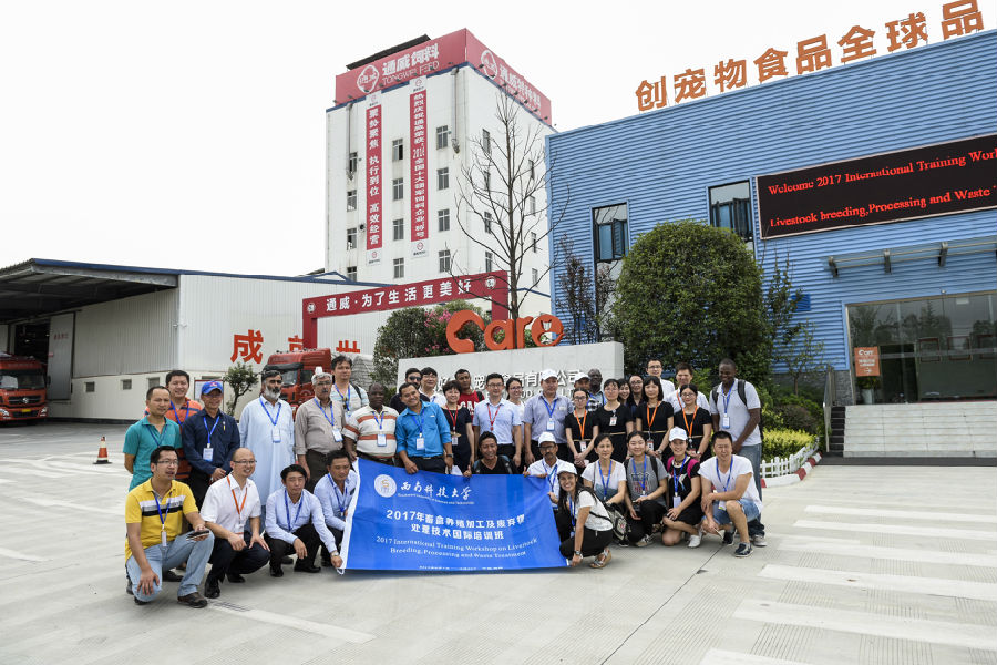 8月7日,“一帶一路”國際培訓班西南科技大學生命科學與工程學院副院長胡尚連、西南科技大學生命科學與工程學院動物科學系主任劉靜波、馬來西亞布特拉大學博士Chen Wei Li一行中外30余人蒞臨通威參觀學習,通威股份有限公司總裁助理劉輝芬、通威特種飼料公司生產(chǎn)部經(jīng)理田林、成都好主人寵物食品有限公司技術總監(jiān)李慶等高層領導熱情接待。