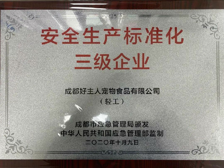 近日,成都好主人寵物食品有限公司榮獲由成都市應(yīng)急管理局頒發(fā)的全生產(chǎn)標(biāo)準(zhǔn)化三級(jí)企業(yè)證書。