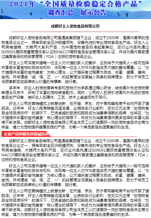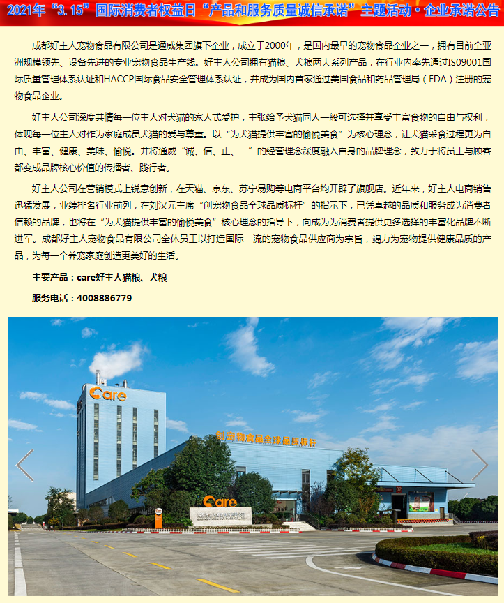 2021年,好主人積極參加了由中國質(zhì)量檢驗協(xié)會舉辦的“3.15”國際消費者權(quán)益日“產(chǎn)品和服務質(zhì)量誠信承諾”活動。到達好主人2021年度“創(chuàng)寵物食品全球品質(zhì)標桿”的第一站: