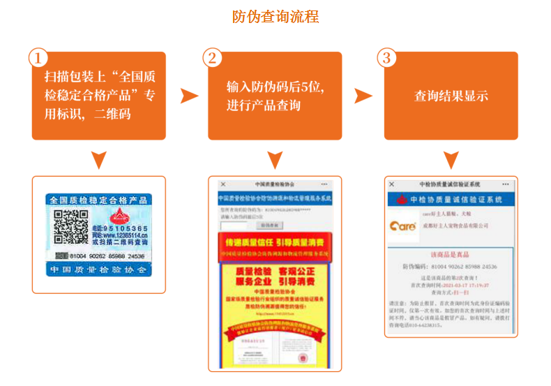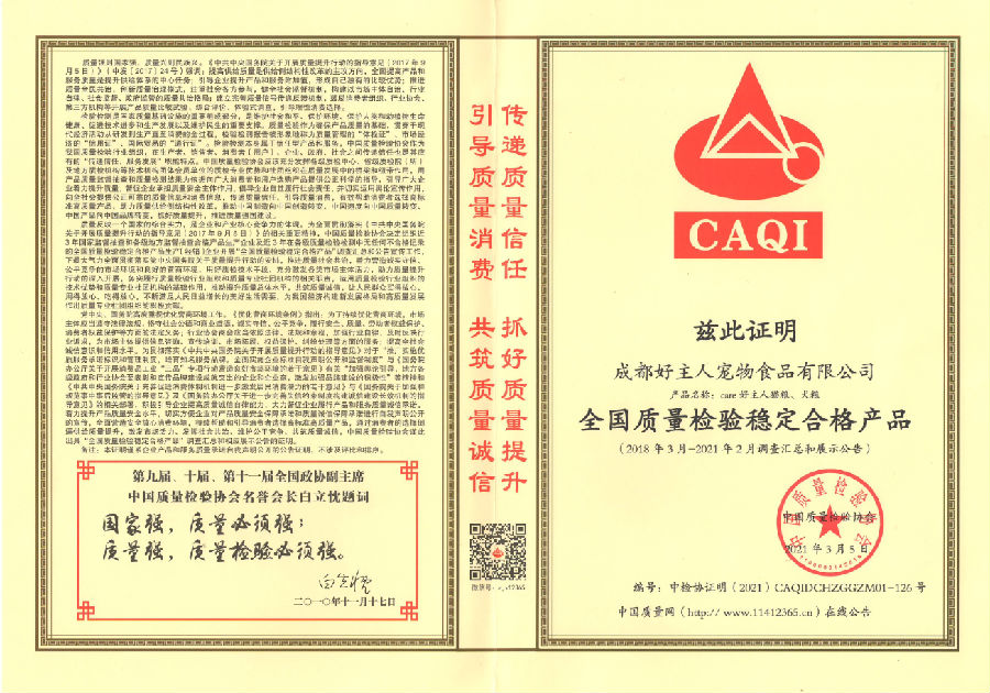 好主人積極搭建同消費者的承諾與信任橋梁,榮獲中國質(zhì)量檢測協(xié)會的“全國質(zhì)檢穩(wěn)定合格產(chǎn)品”專用標識。并將其運用于好主人產(chǎn)品包裝上,便于消費者進行產(chǎn)品防偽與檢測報告查詢。真正做到讓消費者有碼可查,有質(zhì)可證。主人買得放心,愛寵吃得開心。