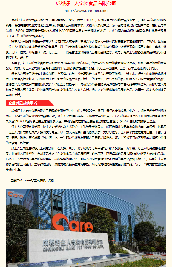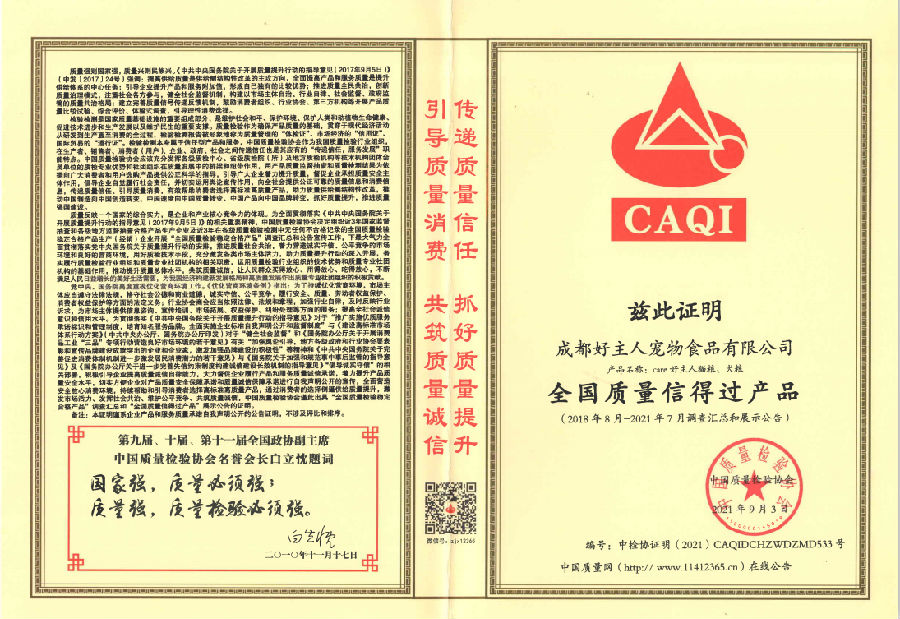 好主人公司自2000年成立以來,一直將產(chǎn)品品質(zhì)作為企業(yè)核心競爭力。遵照“把好主人打造為亞洲一流、全球領(lǐng)先的寵物食品企業(yè)”的重要指示,認真踐行企業(yè)質(zhì)量誠信承諾!