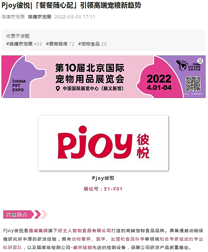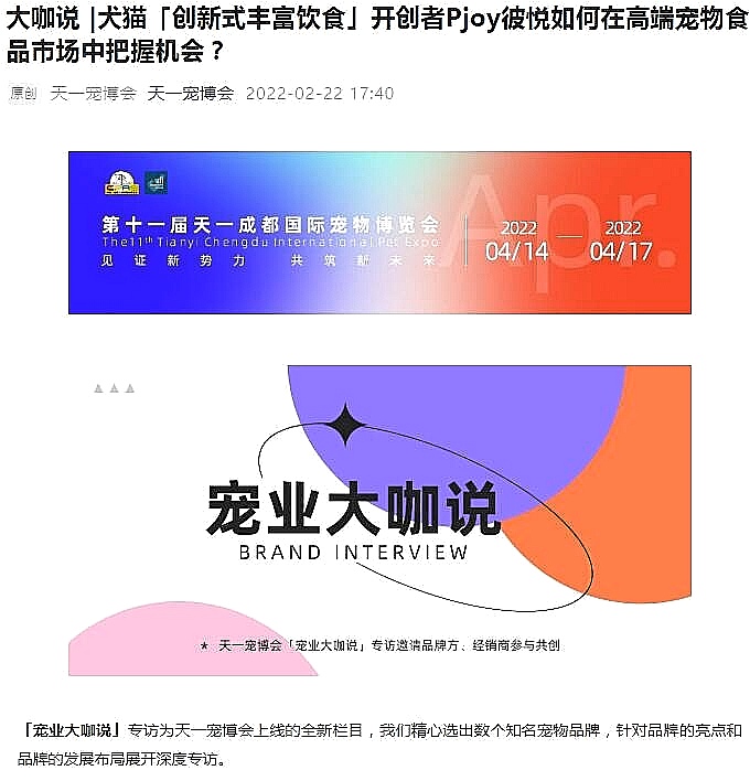 展會(huì)來臨前,Pjoy彼悅接受了雄鷹·京寵展的品牌推薦以及成都國(guó)際寵博會(huì)「寵業(yè)大咖說」的品牌專訪。展現(xiàn)了在中國(guó)人均可支配收入持續(xù)增加以及養(yǎng)寵日趨人性化等宏觀背景下,中國(guó)高端寵物食品品類迎來了新的機(jī)遇,Pjoy彼悅?cè)绾伟盐諜C(jī)會(huì)在一眾品牌中脫穎而出,開創(chuàng)高端寵物食品新格局。