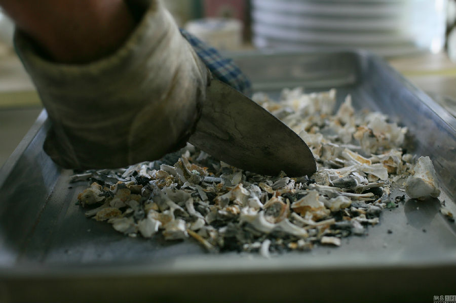 火化不僅可以徹底去除尸體上的病菌病毒、做到無害化處理,還可以為飼養(yǎng)寵物畫上一個(gè)規(guī)范的句號(hào)。圖為工作人員戴著手套將骨灰清理。