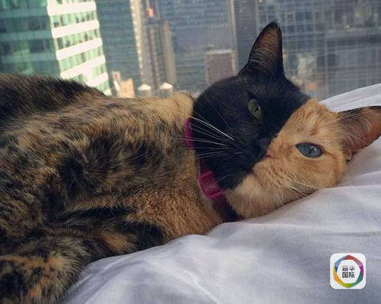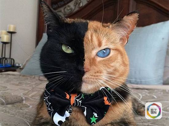 不爽貓、憤怒貓、驚訝貓、斗眼貓,現(xiàn)在又來了“分裂貓”?!∵@只5歲的貓名叫“維納斯”,左臉為黃色,右臉為黑色,分界線正好位于臉中央。不止如此,它的眼睛和胡須顏色也不一樣,黑臉一側(cè)的眼睛是綠的,胡須是黑的;黃臉一側(cè)是藍(lán)眼睛、白胡子。